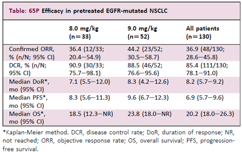 研究共176例患者入组并接受治疗。在EGFR突变阳性 NSCLC组(n=130)中,患者的中位既往系统性抗肿瘤治疗线数为2(1-8),所有患者此前均接受过EGFR-TKI治疗(三代药物,89.2%),且64.6%的患者既往接受过含铂化疗(PBC)。截至数据截止(2025年11月20日),中位随访时间为18.0个月。SHR-A2009在8.0 mg/kg和9.0 mg/kg剂量下均显示出令人鼓舞的活性和具有临床意义的生存结果(详见表)