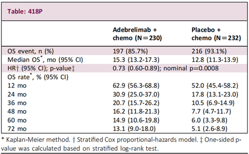 阿得贝利单抗联合化疗对比安慰剂联合化疗OS获益持续存在(HR 0.73,95% CI:0.60–0.89;单侧名义p值=0.0008)。在48、60和72个月时,阿得贝利单抗组的OS率较安慰剂组提升超过一倍(见表)。在各临床相关亚组中,阿得贝利单抗带来的OS获益总体一致。完成2年阿得贝利单抗治疗的20例患者,全部(100%)获得客观缓解;其48、60和72个月的OS率均为80.0%。未观察到新的安全性信号。